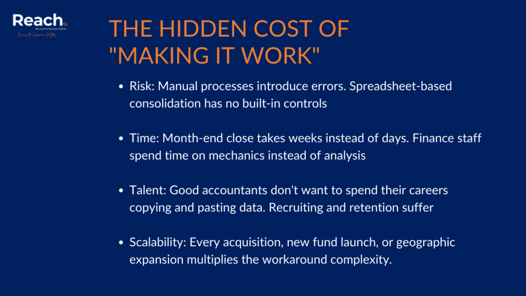 Many investment managers have spent years customizing, extending, and working around ERP limitations. They’ve built Access databases to track what the ERP can’t. They’ve created elaborate Excel models for consolidation. They have people whose entire job is manually moving data between systems.
