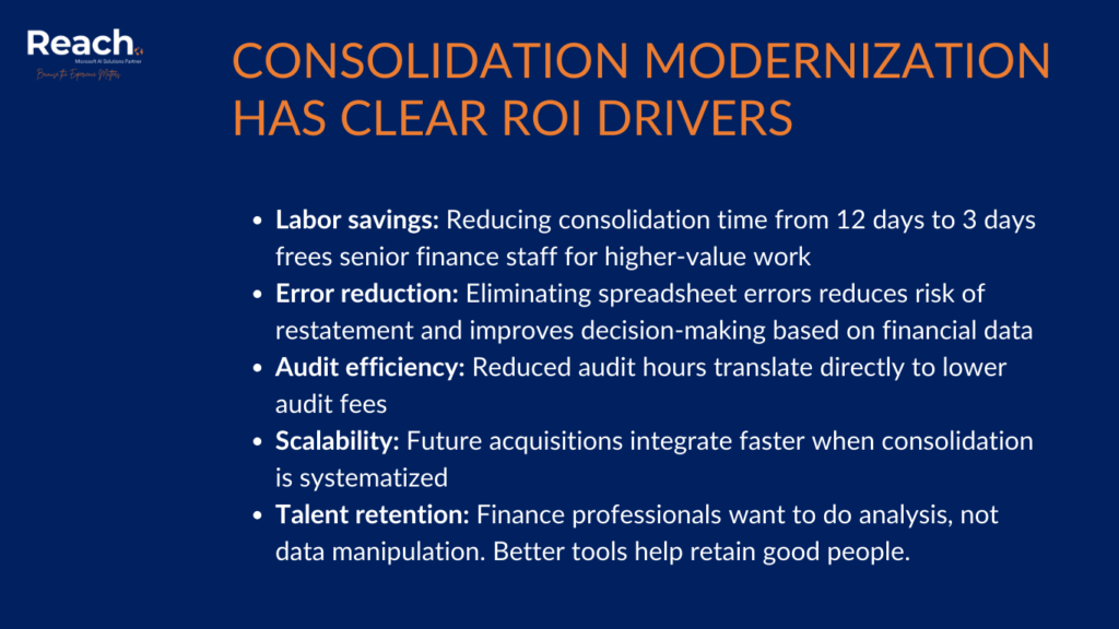 - Labor savings: Reducing consolidation time from 12 days to 3 days frees senior finance staff for higher-value work.