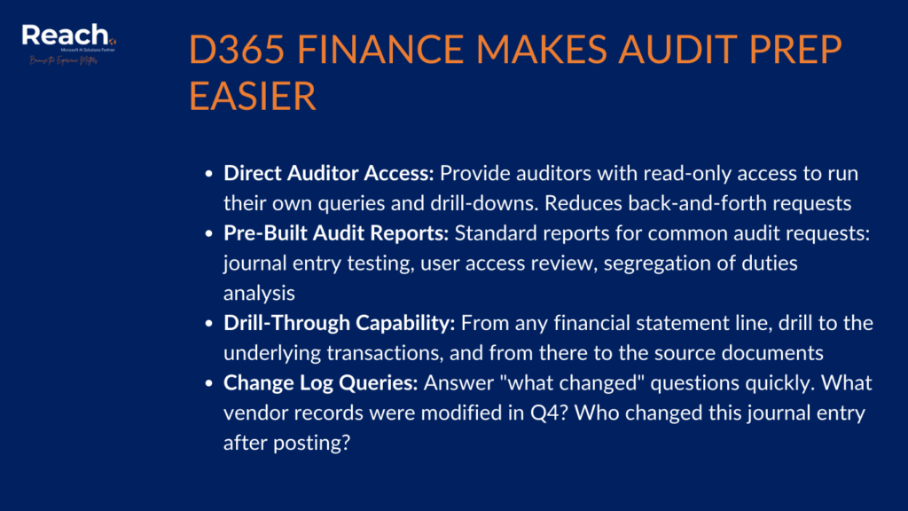 Audit Trail: Every transaction and every master data change is logged. Who created it, when, from what workstation, and any subsequent modifications. D365 Finance maintains this audit trail automatically without user action.